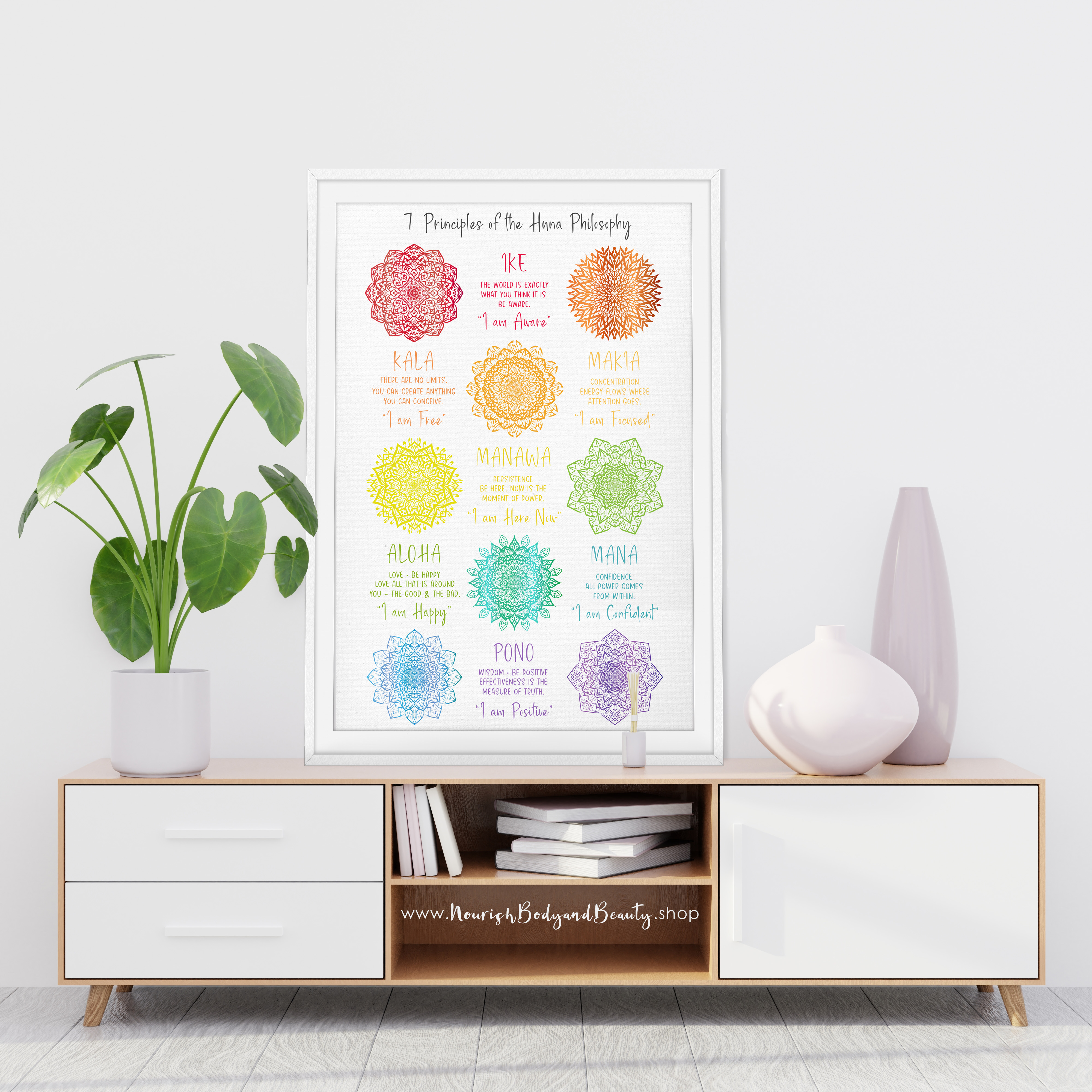 This poster features the 7 Principles of Huna Philosophy with beautiful Mandalas in bright chakra colours.