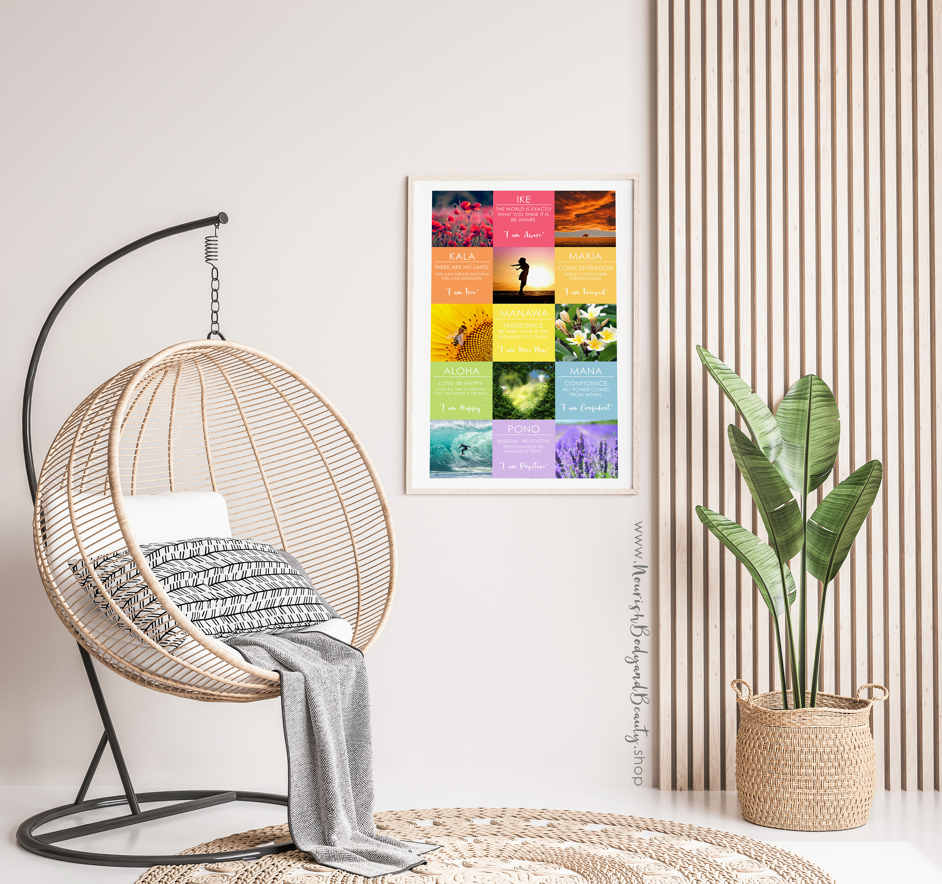 This beautiful poster features the 7 Principles of Huna Philosophy with chakra colours and inspiring natural images.
